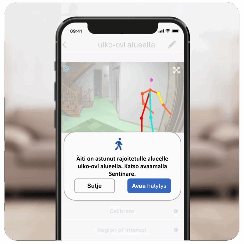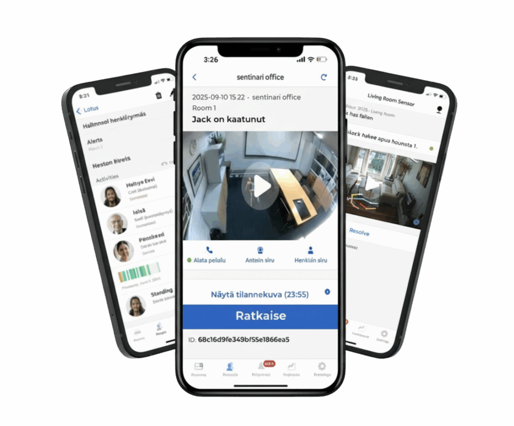 Hoitohenkilökunta voi seurata tapahtumia reaaliajassa, tarkastella historiatietoja ja vastaanottaa selkeitä hälytyksiä Sentinare-sovelluksen kautta. Tämä mahdollistaa nopean ja tietoon perustuvan reagoinnin esimerkiksi kaatumisiin tai avunpyyntöihin.